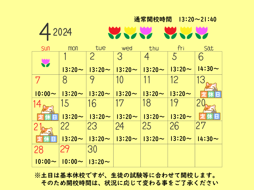 基本的に土日は休校の為,開校時間が変則的になりますこと,