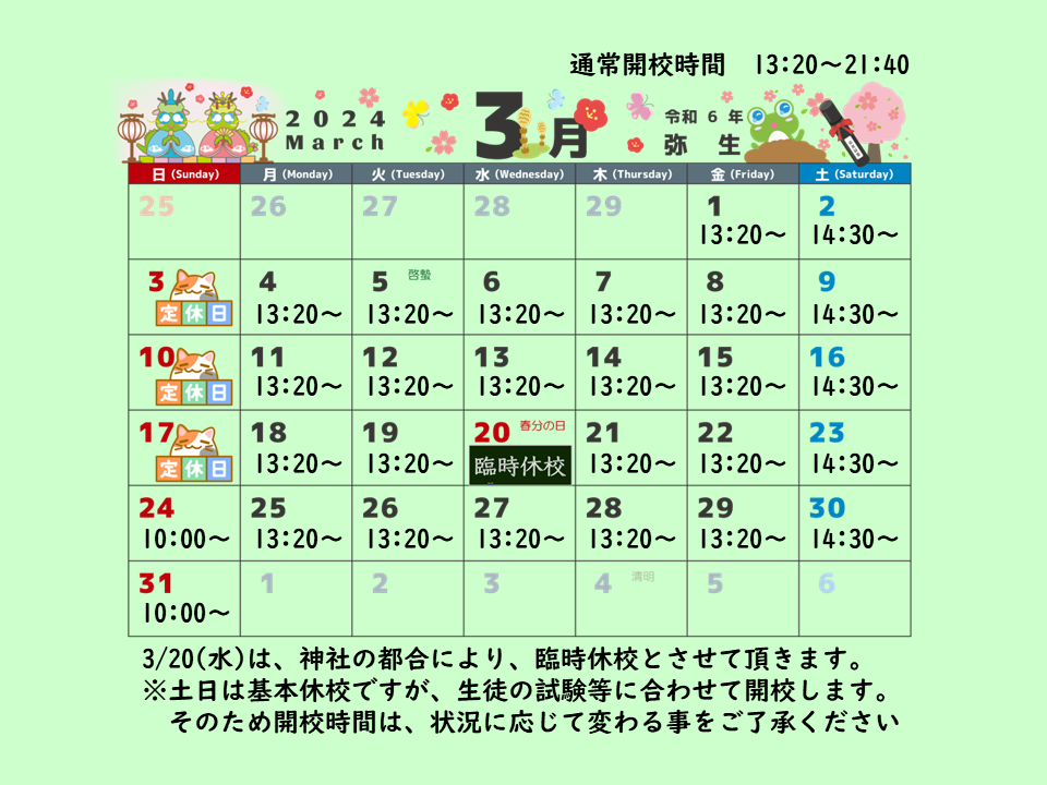 基本的に土日は休校のため,開校時間が変則的になりますこと,